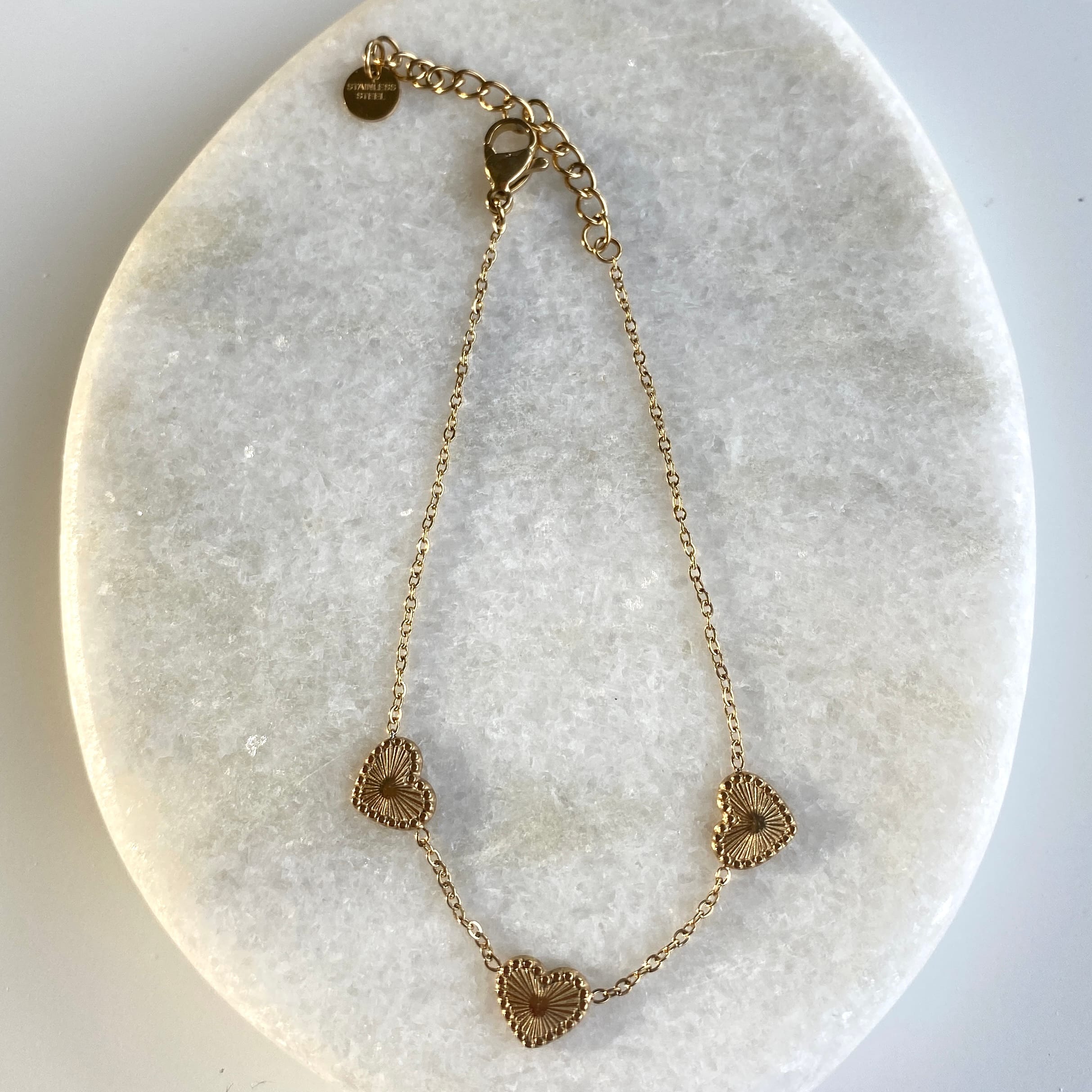 Hoe tof is dit gouden armbandje met 3 hartjes. Het armbandje heeft een schattige uitstraling en is voorzien van een verstelbare sluiting. Dankzij de verstelbare sluiting kun je het armbandje dragen vanaf 16 tot en met 19 cm, ideaal toch! Het armbandje is gemaakt van stainless steel en verkrijgbaar in de kleuren goud en zilver! Superleuk voor aankomend seizoen!
