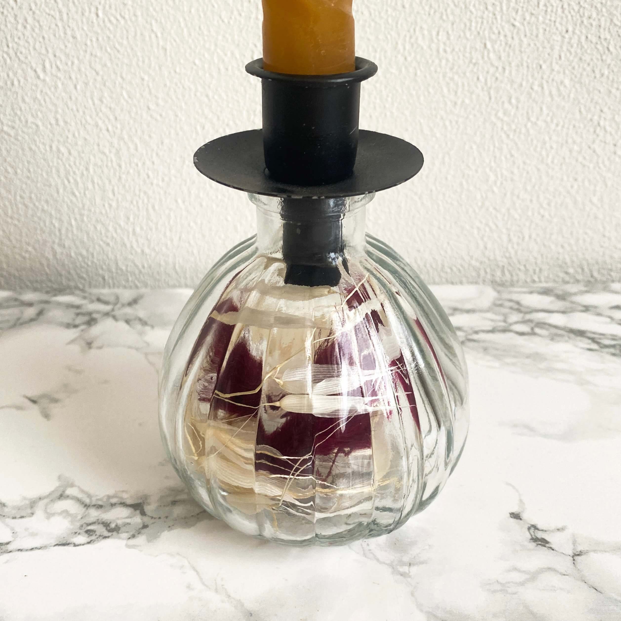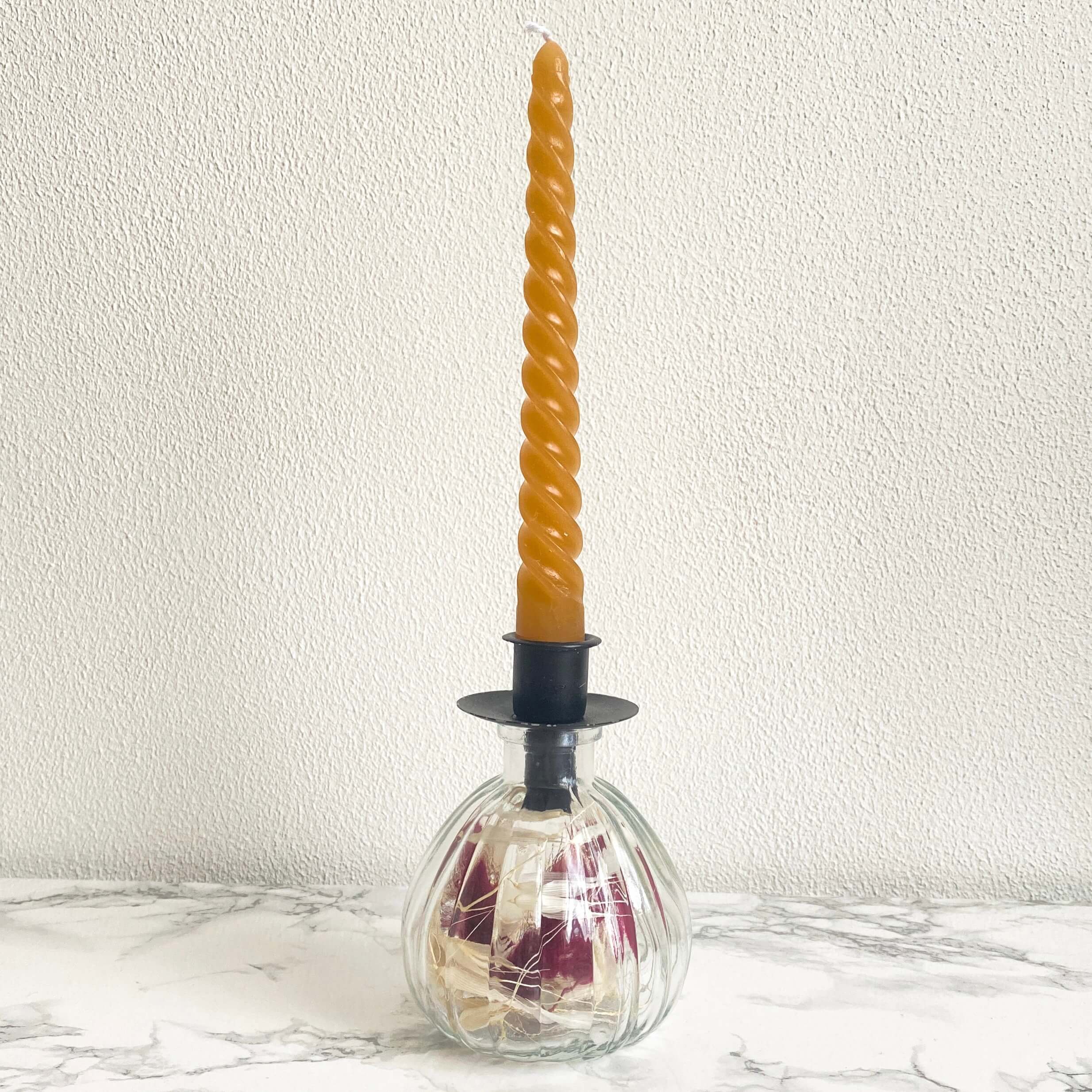Wauw! Hoe superleuk is deze kaarsenhouder in de vorm van een bolletje met ribbels inclusief roze en witte droogbloemetjes! Superleuk voor elk interieur en daarnaast de perfecte cadeautip. De kaarsenhouder heeft een zwarte kaarsen standaard en is daarnaast voorzien van een gele draaikaars! Het ideale item om jouw inrichting op te fleuren.
