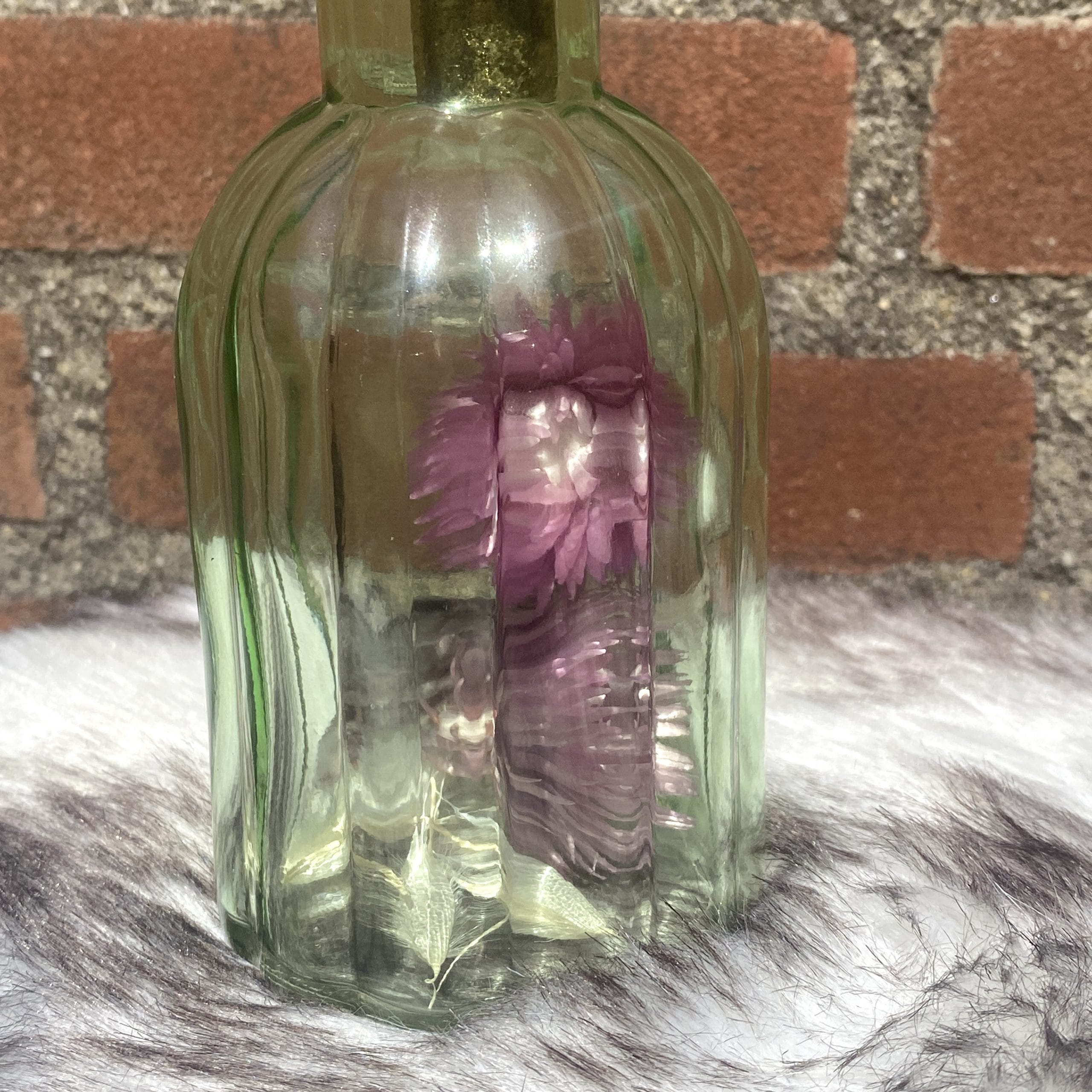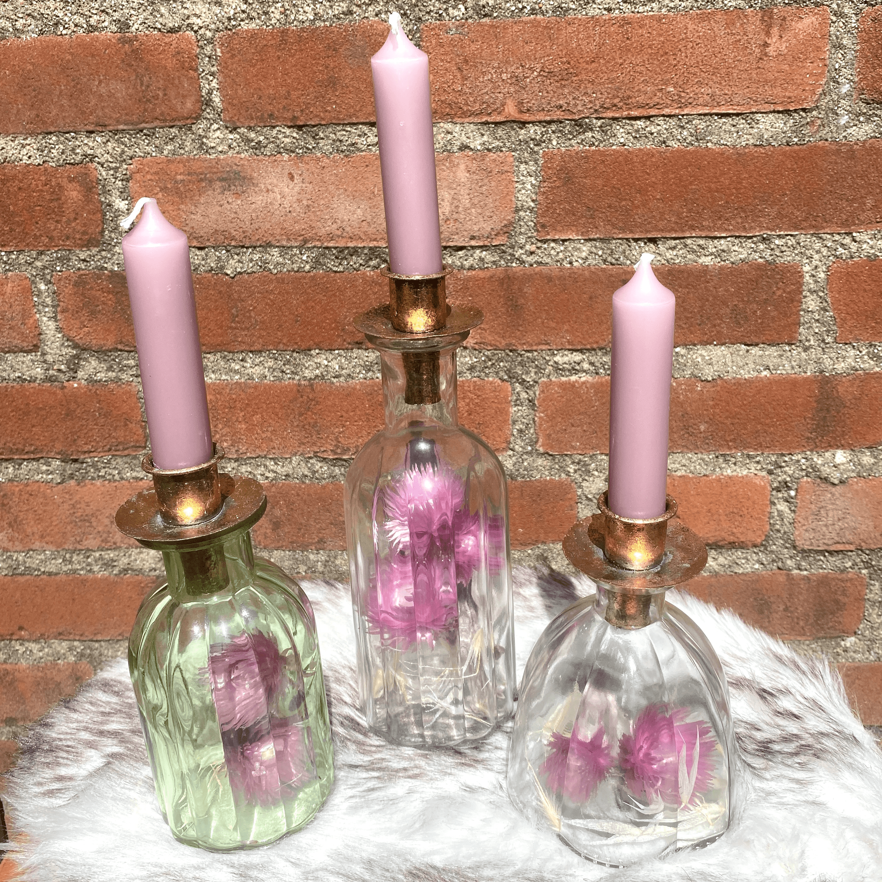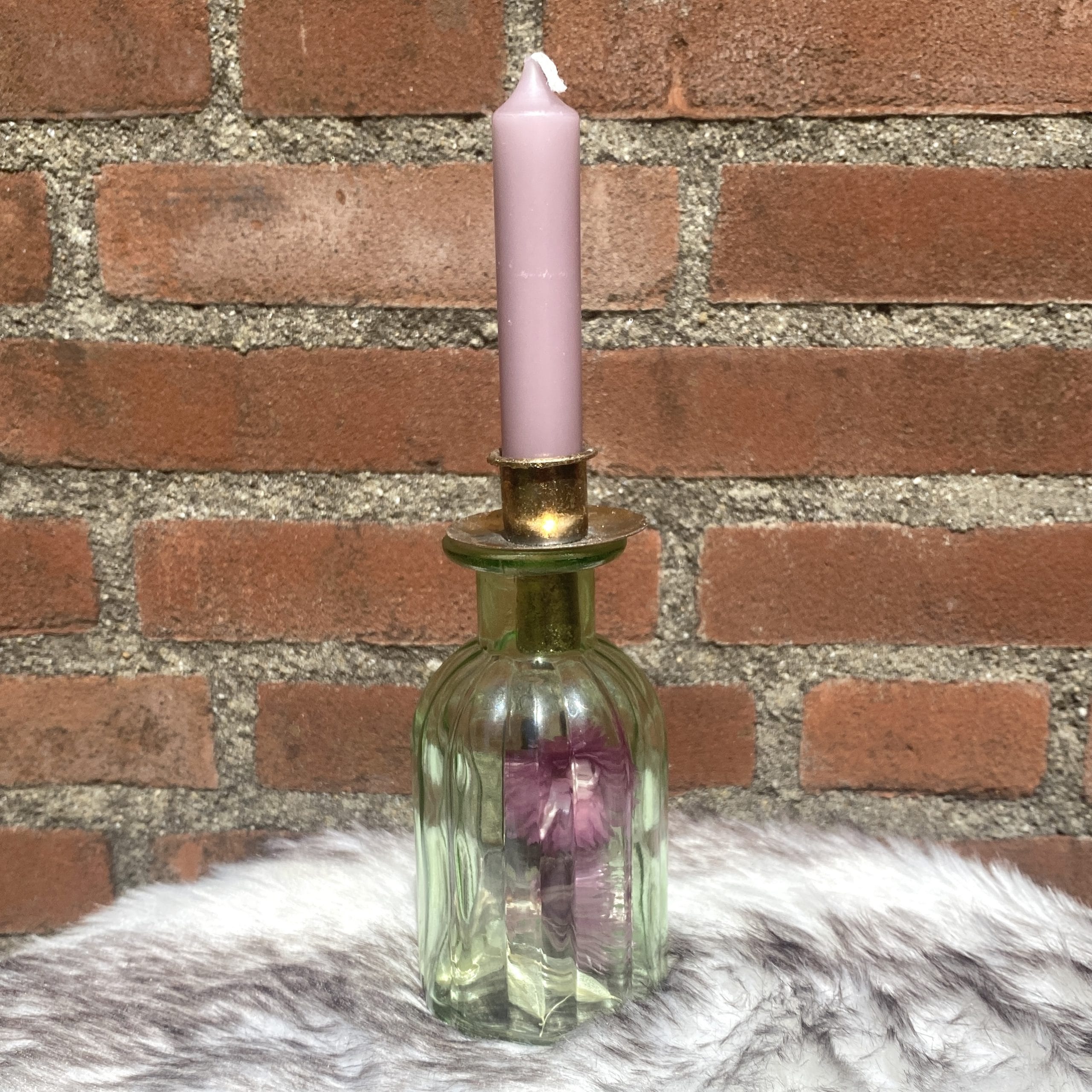 Leuke glazen kaarsenhouder gemaakt van geribbeld groen glas. De kaarsenhouder is 15 cm hoog en is voorzien van mooie roze/paarse droogbloemen. De kaarsenhouder wordt geleverd inclusief lila kleurige kaars en gouden kaarsenhouder.