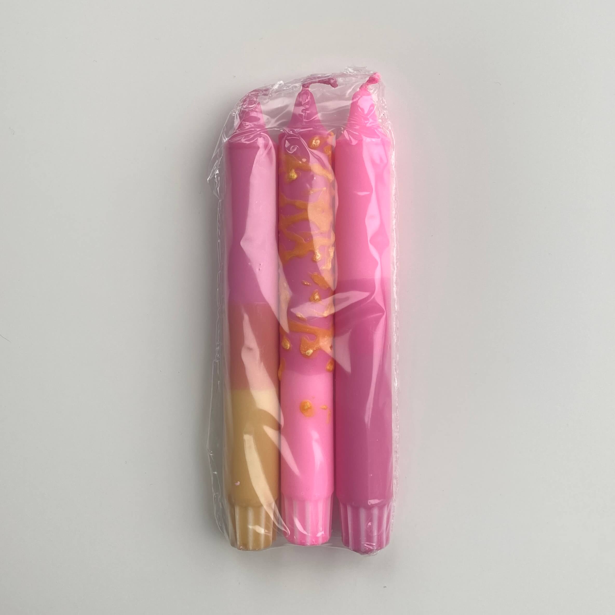 Van deze kaarsenset in de kleuren roze & goud word je toch meteen vrolijk! De drie kaarsen passen perfect bij elkaar en zijn een combinatie van dip dye kaarsen met een confetti kaars! Helemaal leuk voor aankomend seizoen. Fleur jouw kantoor of slaapkamer op met deze prachtige kaarsen! Ook verkrijgbaar in een oranje&roze variant. De kaarsen hebben een afmeting van 19 x 2 cm en zijn gemaakt van stearine.