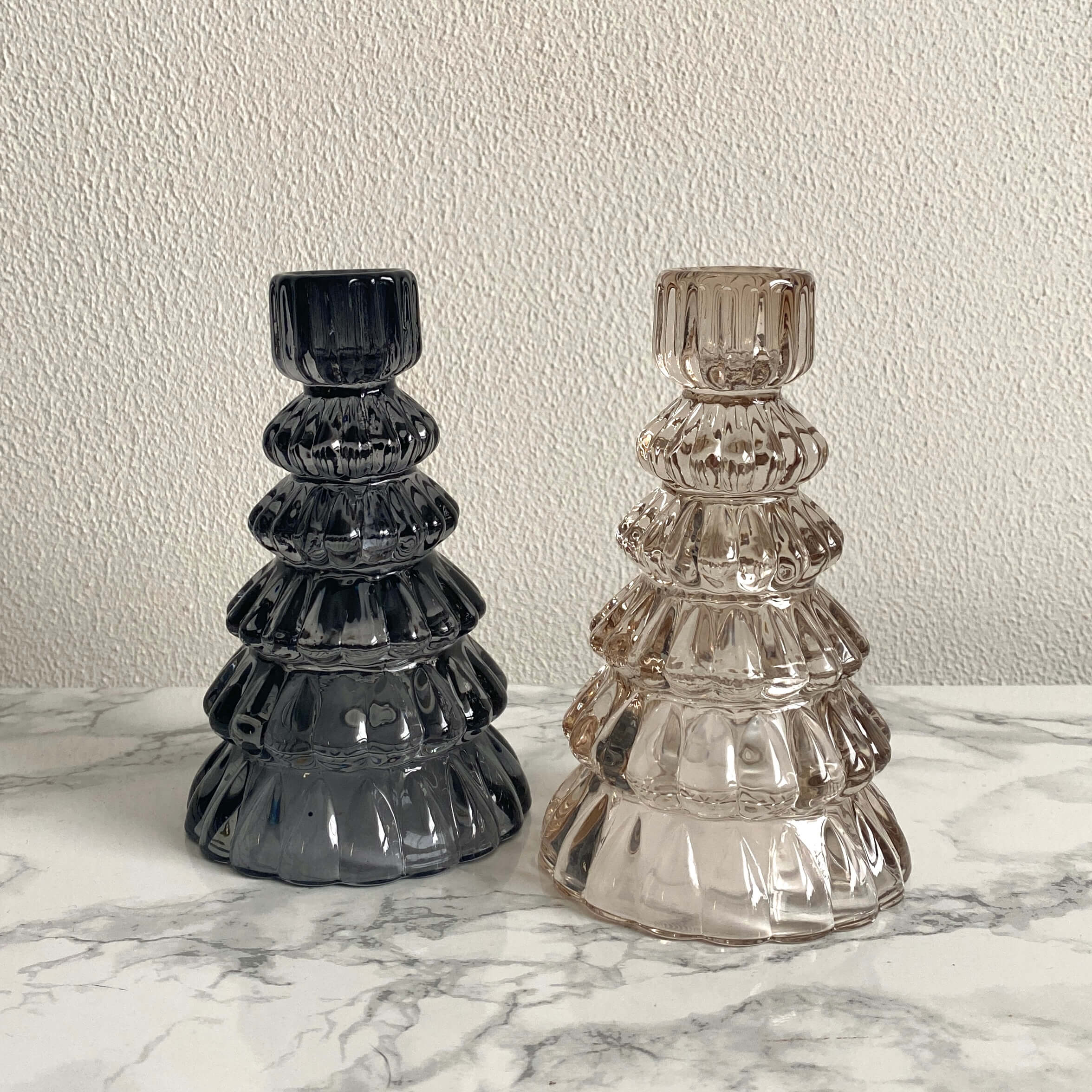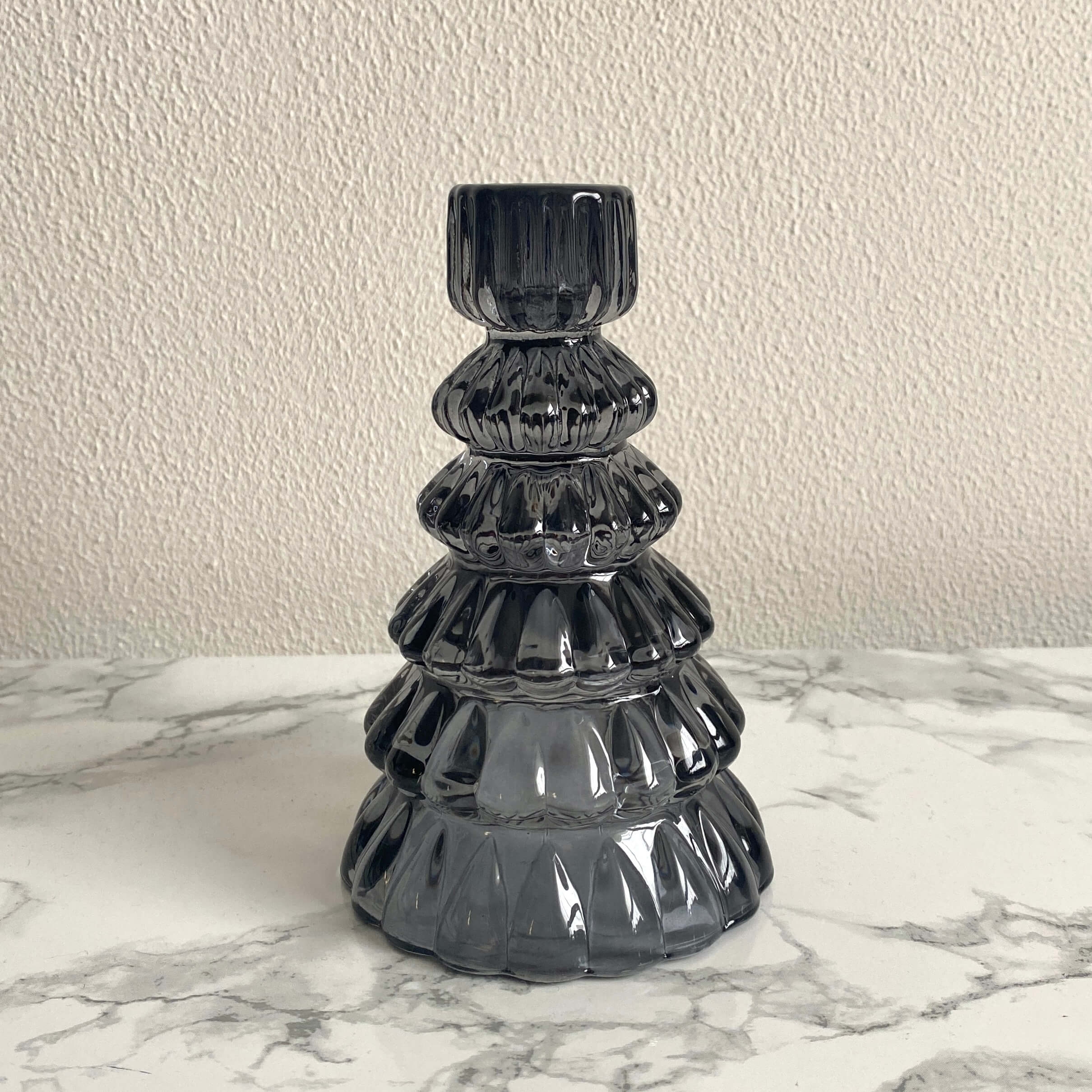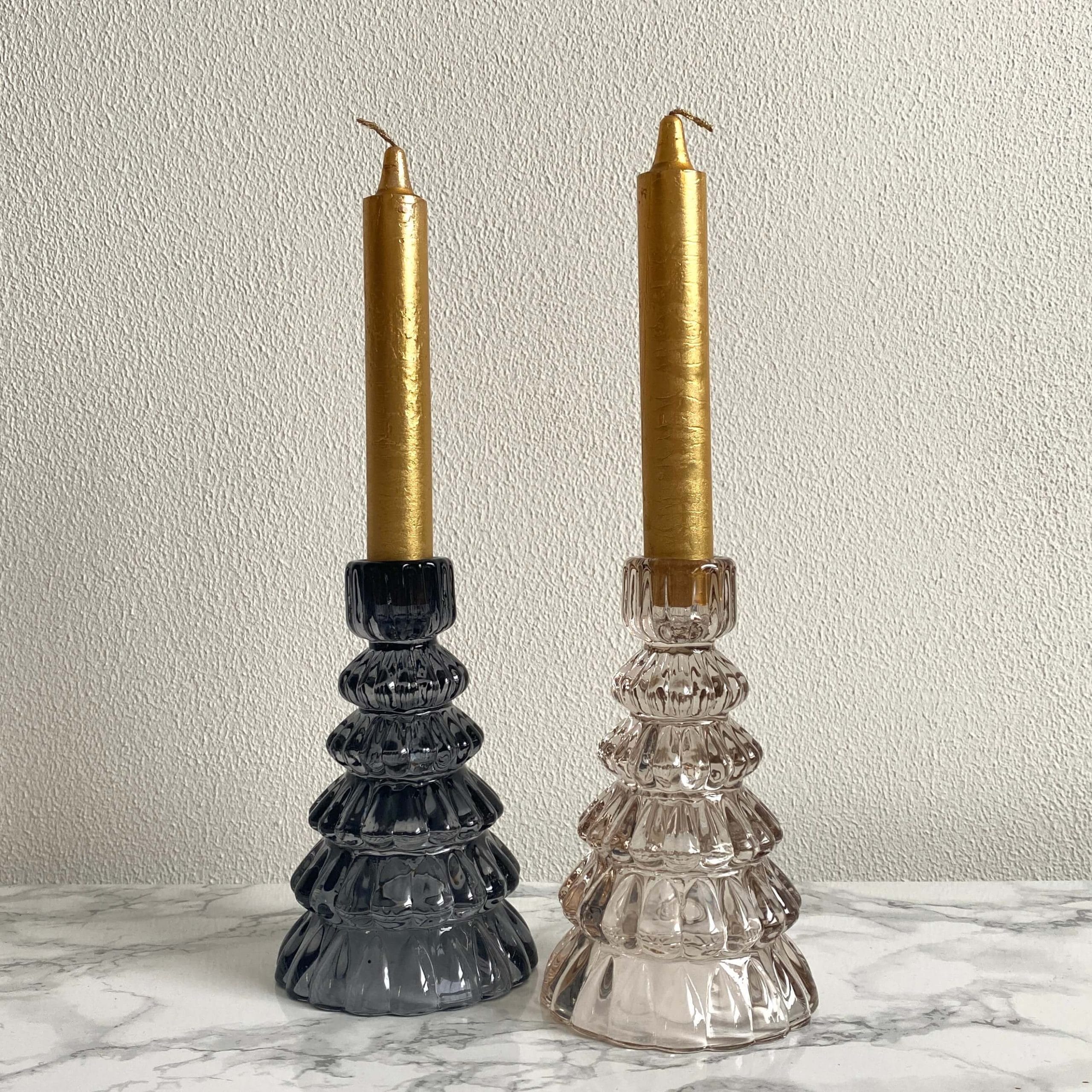 Kaarsenstandaard in de vorm van een kerstboom gemaakt van glas. De kaarsenstandaard is 13,5 cm hoog en heeft de kleur zwart. Naast de kleur zwart is deze standaard ook verkrijgbaar in het lichtroze! Superleuk voor de feestdagen of om cadeau te geven!