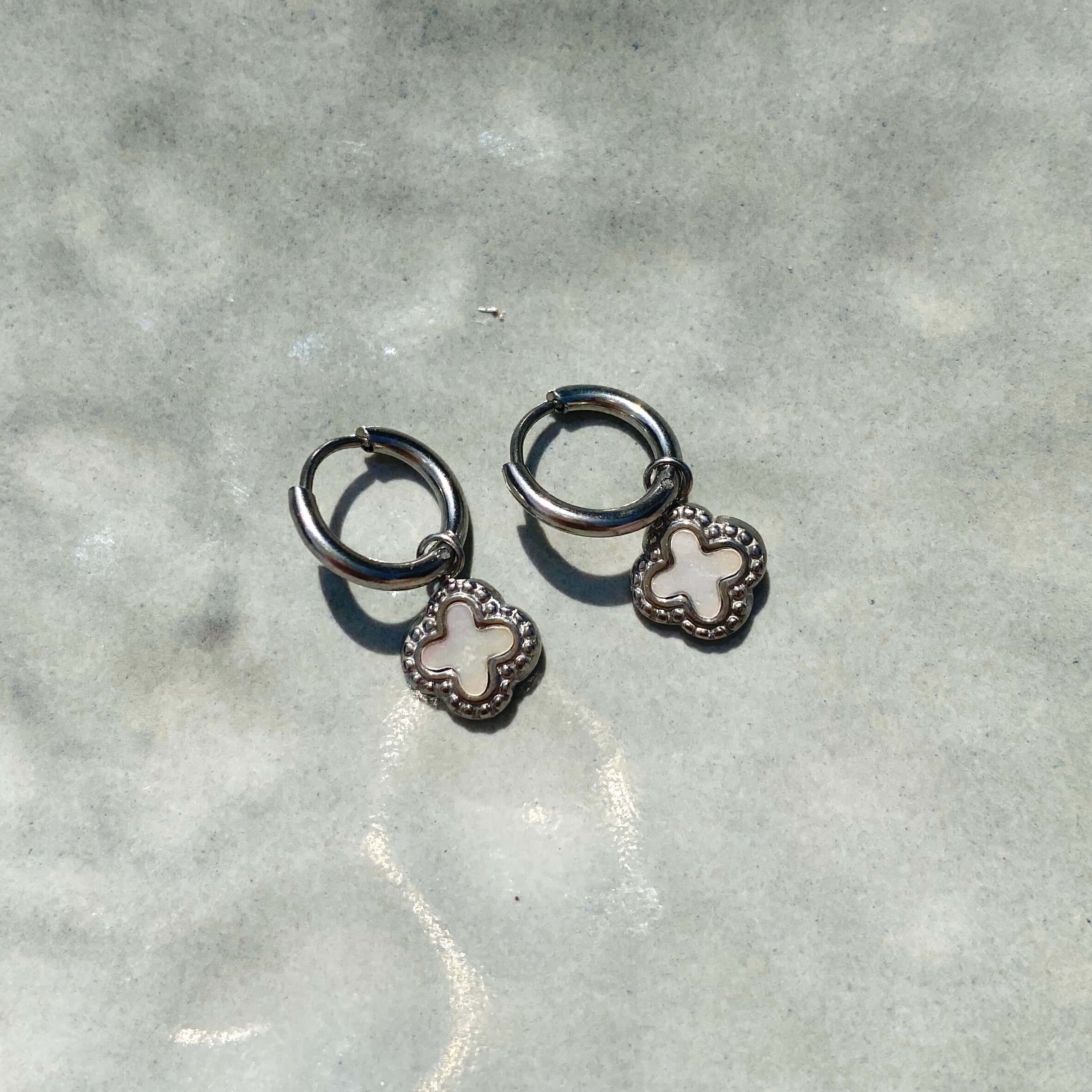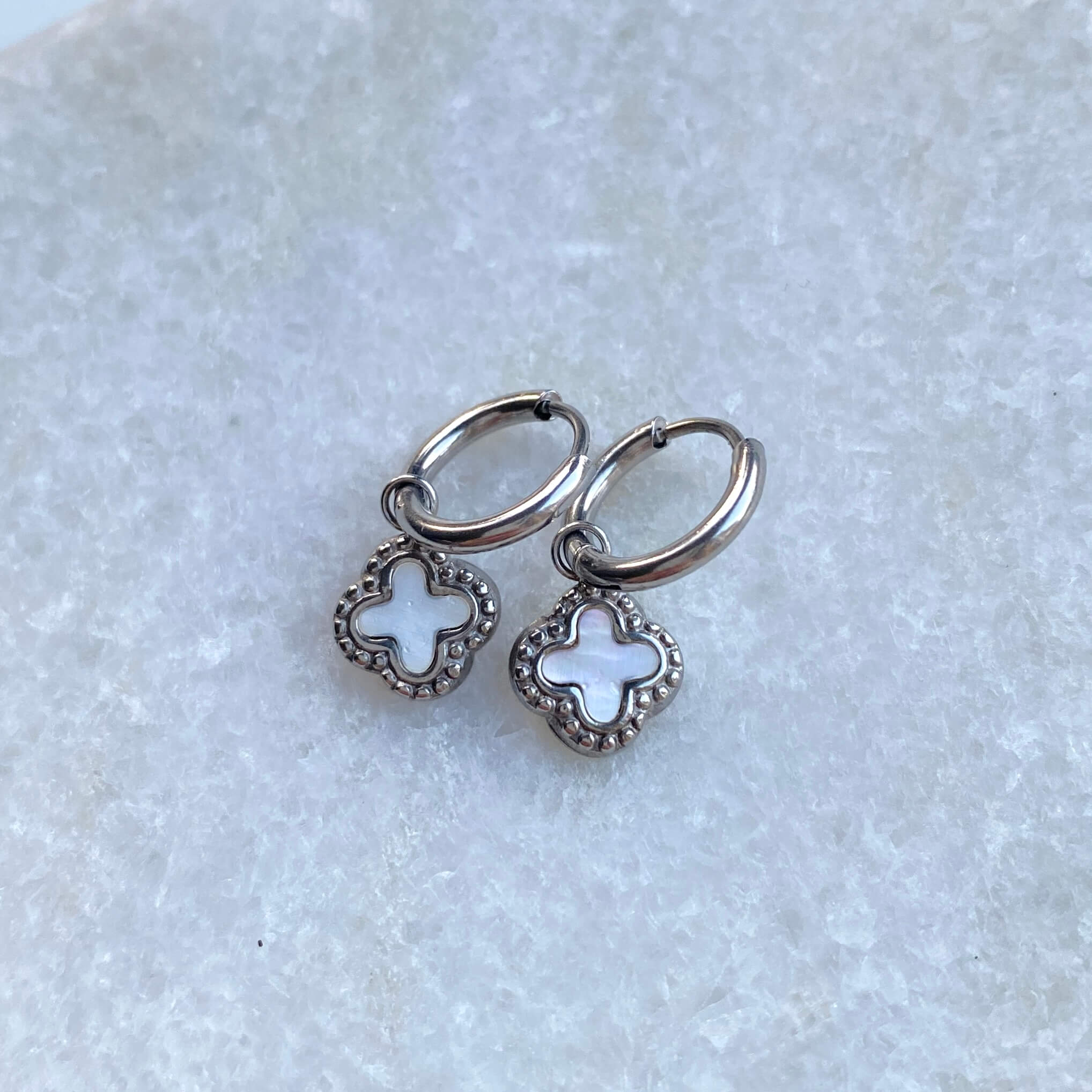 Stainless steel oorbellen in de kleur zilver met witte details in de vorm van een klaver. De oorbellen zijn 2 cm lang. Combineer deze oorbellen leuk met andere zilveren oorbellen voor een leuke ear party! Deze oorbellen zijn ook verkrijgbaar in het zilver met zwart en goud met zwart. Leuk om deze oorbellen te combineren met de matchende armband.