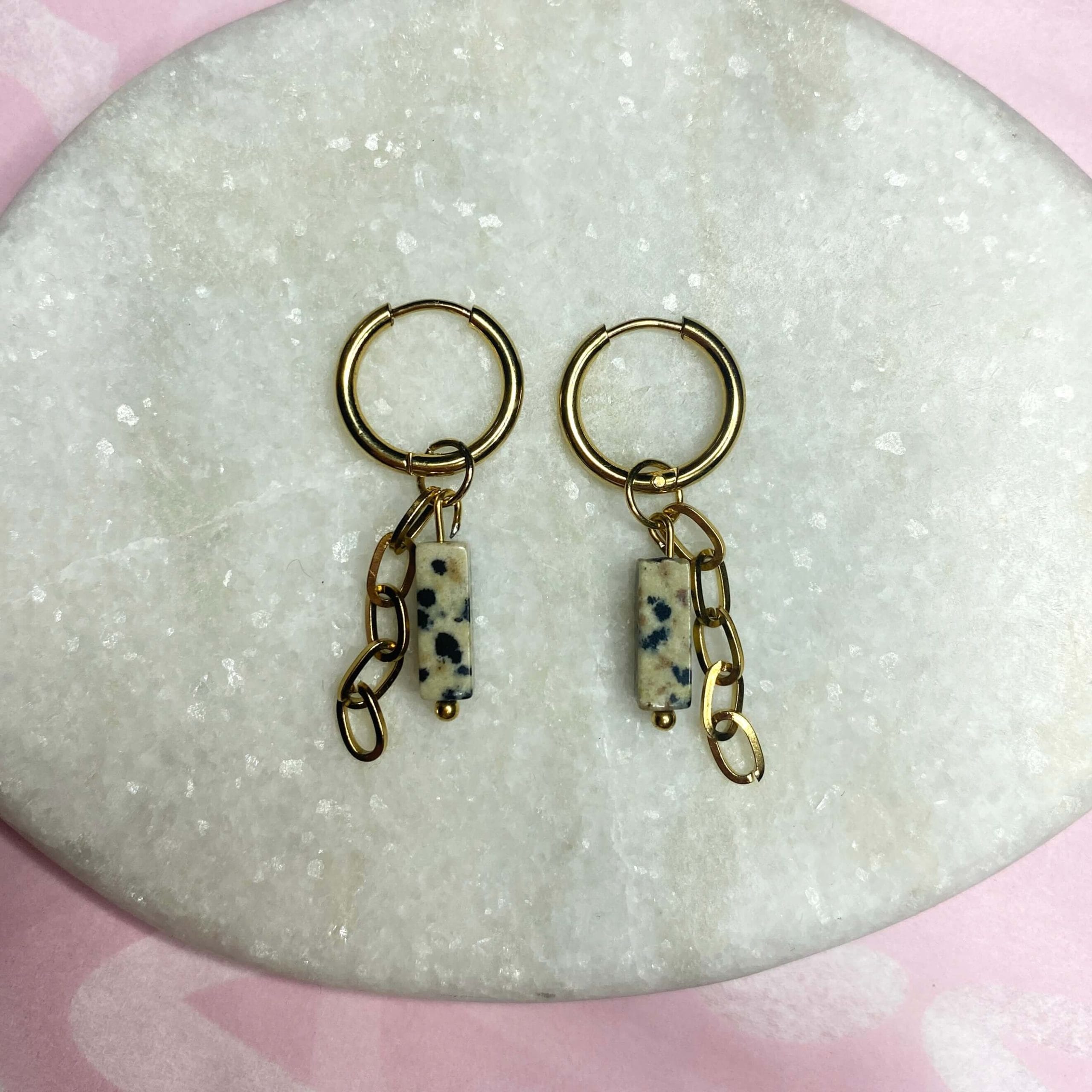 Shop deze handgemaakte gouden oorbellen met beige/zwarte langwerpig steentje met printje nu bij Livs and Gifts! Naast de beige steen met print is de oorbel voorzien van een een goud grof kettinkje. De goudkleurige hoops hebben een lengte van 1,6 cm en de totale oorbel heeft een lengte van 4,5 cm. De oorbellen zijn gemaakt van Stainless steel in combinatie met steen. Superleuk om deze oorbellen te combineren met meerdere goudkleurige sieraden! Ook verkrijgbaar in andere kleurenvariaties.