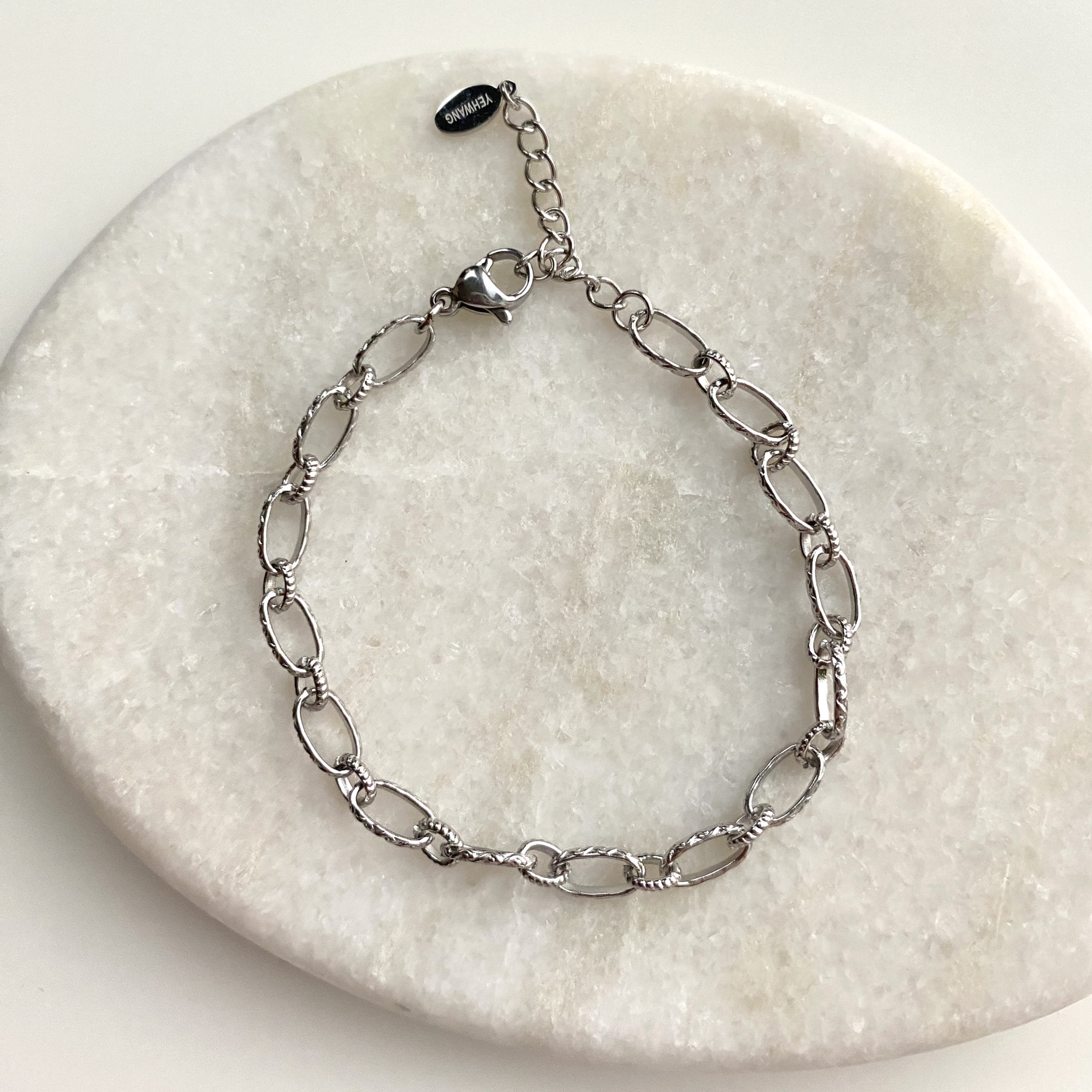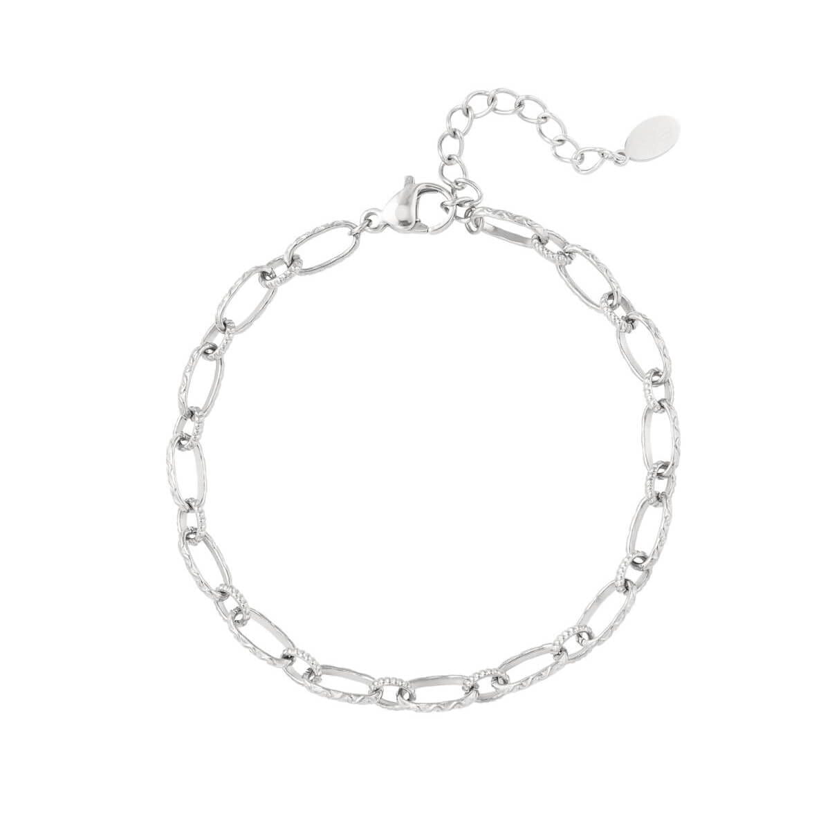 Deze subtiele schakelarmband met verschillende soorten schakels in de kleur zilver is een echte musthave voor jouw sieraden stash! Superleuk om deze armband met meerdere kleurrijke en zilveren sieraden te combineren voor een speelse en echte festival look! De armband is ook perfect enkel te dragen voor een casual look. De lengte van de armband is eenvoudig te verstellen vanaf 16 cm, tot en met 19 cm. De armband is gemaakt van stainless steel en blijft daarom superlang mooi!