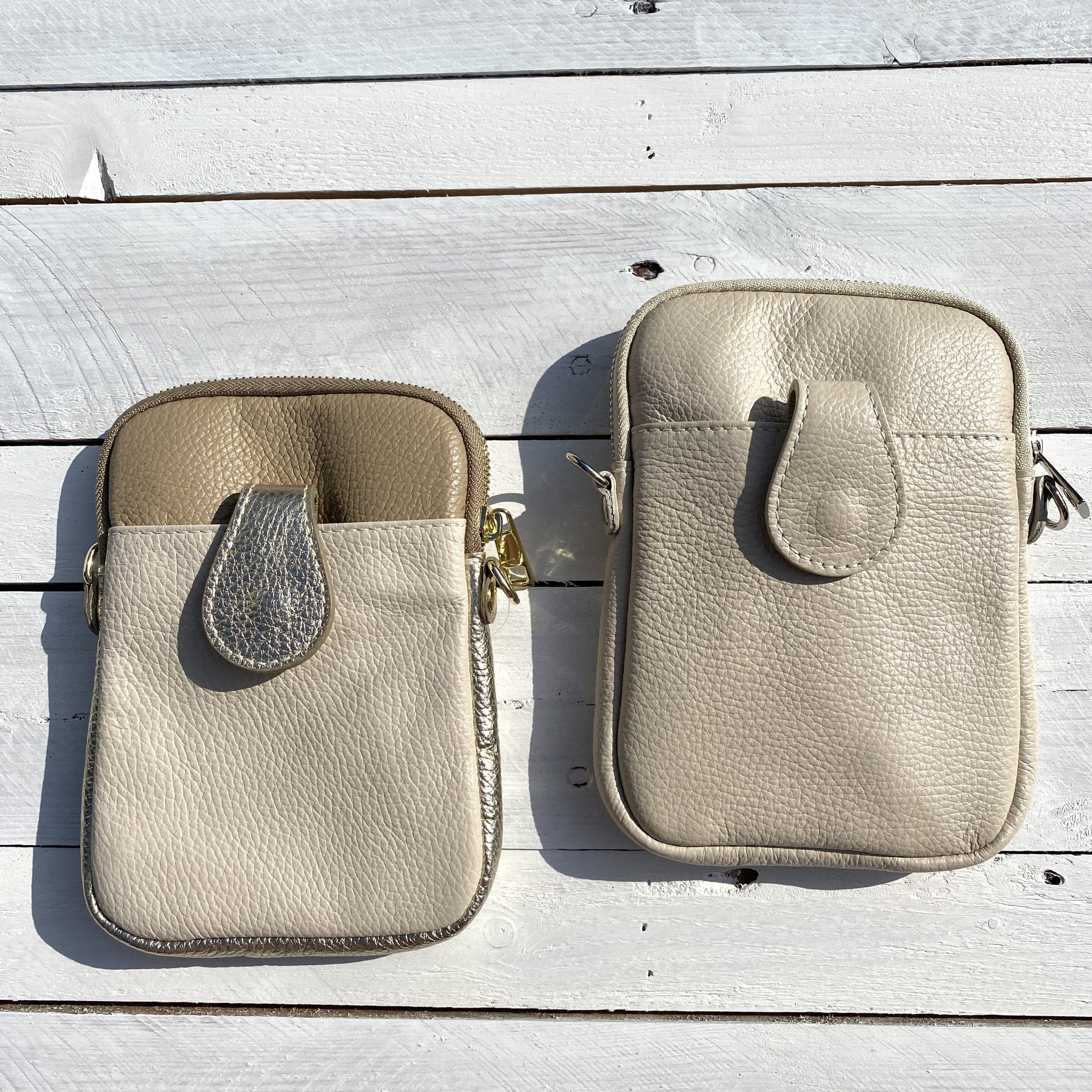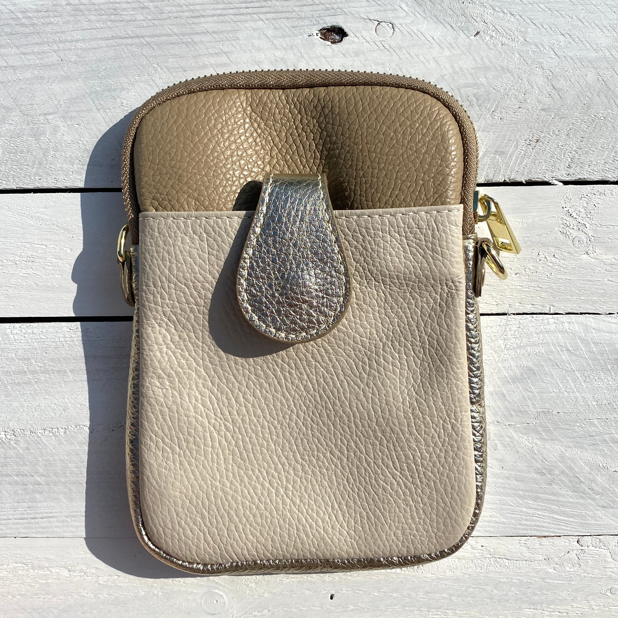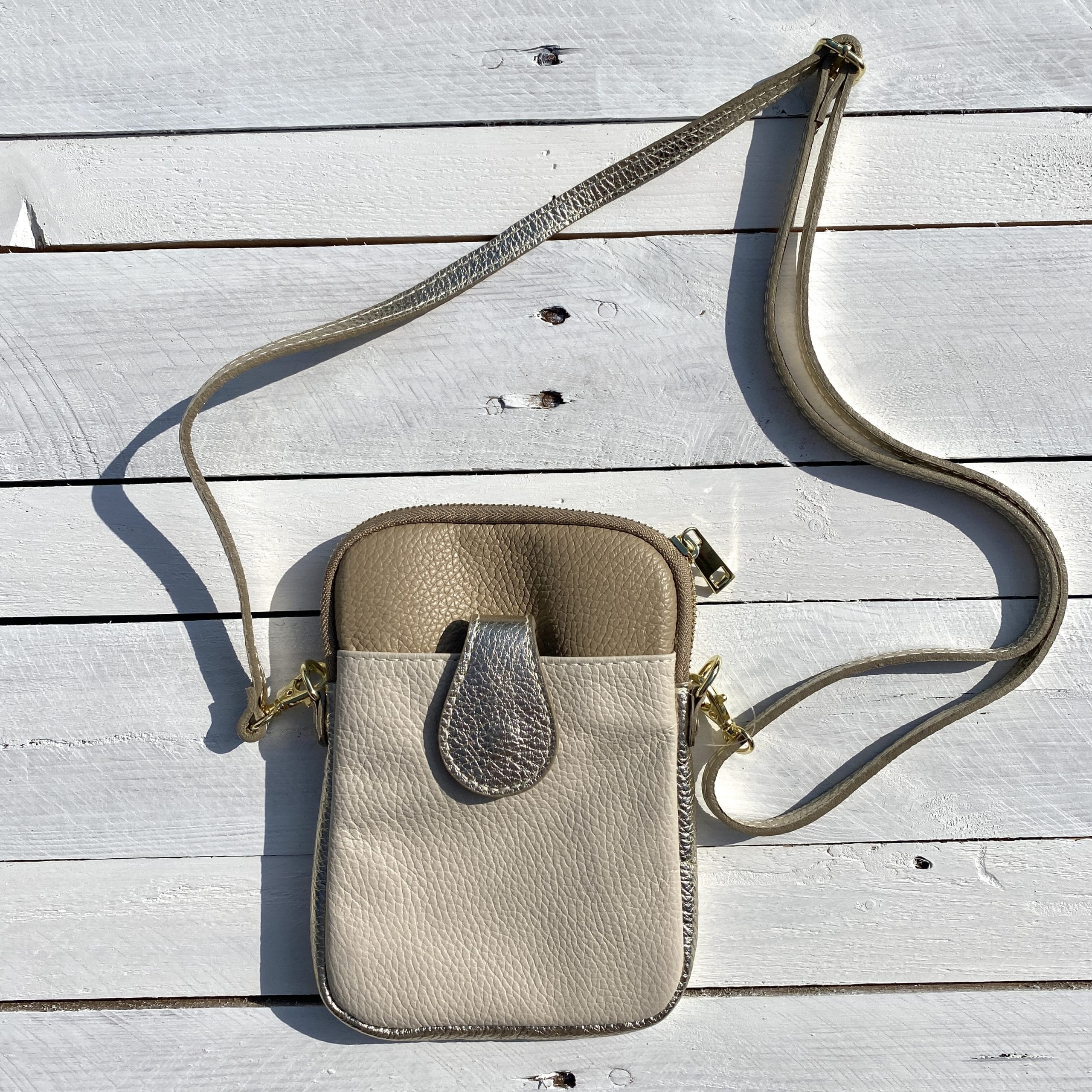 Tas June is gemaakt van leer in de kleuren beige, taupe en metallic goud met gouden details en de afmetingen zijn: 14 cm x 20 cm x 3 cm . De tas is voorzien van een afneembaar en verstelbaar hengsel. De tas heeft 2 vakken en een extra vak voor op de tas, genoeg ruimte voor al jouw portemonnee, sleutels, telefoon en nog meer. Perfect te dragen voor bijvoorbeeld een festival. De tas is leuk te combineren met een bag strap!